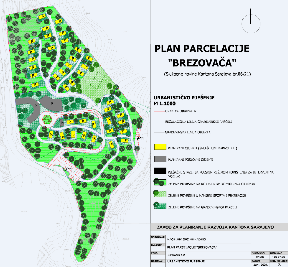The spatial scope of the area of 2.93 ha is located at the Brežovača site in the territory of the Hadžići municipality. The spatial organization concept is based on providing urban and planning prerequisites for the construction of a tourist complex with accommodation facilities and accompanying amenities, respecting natural values and existing vegetation, as well as the conditions imposed by the topography of the terrain. The proposed solution in the scope in question plans the construction of: 40 facilities (accommodation facilities), 1 business facility (info desk), 1 business facility (restaurant with accompanying amenities), a sports and recreation area, and a green zone where construction is not allowed.