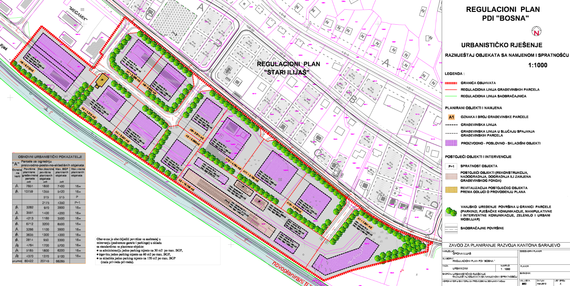 The area of 6.5 ha, included by the Plan boundary, is located on the right side of the Bosna River, and includes part of the former Šipad timber mill. It is limited to the northeast by Bosanski put Street, to the southeast by the individual housing zone, to the southwest by the Šamac - Sarajevo railway, and to the northwest by the economic zone. According to the Urban Plan of the City of Sarajevo, for the urban area of Ilijaš, for the period from 1986 to 2015, the subject area is located in the zone of "economic zones and small businesses". Before privatization, there was one economic entity on this site - the Šipad timber mill - as a single functional unit, with an internal traffic and other infrastructure network. The total area of 15.0 ha, with privatization, comes into the ownership of several owners, and in accordance with the resulting situation, the development of the Plan was initiated for the area of 6.5 ha. Given that the area covered by the Plan is mostly devastated and that only the capacity of the sawmill plant with accompanying facilities is in function, the spatial organization is focused on the formation of new construction plots for the construction of production-business-storage capacities. The production processes of the planned production and storage facilities must be clean, environmentally friendly, in accordance with EU standards, i.e. based on modern production facilities within a specific activity. The proposed spatial organization plan plans eleven plots for the construction of new capacities and defines a twelfth plot for the complex of the existing sawmill, for which the possibility of reconstruction is envisaged.
