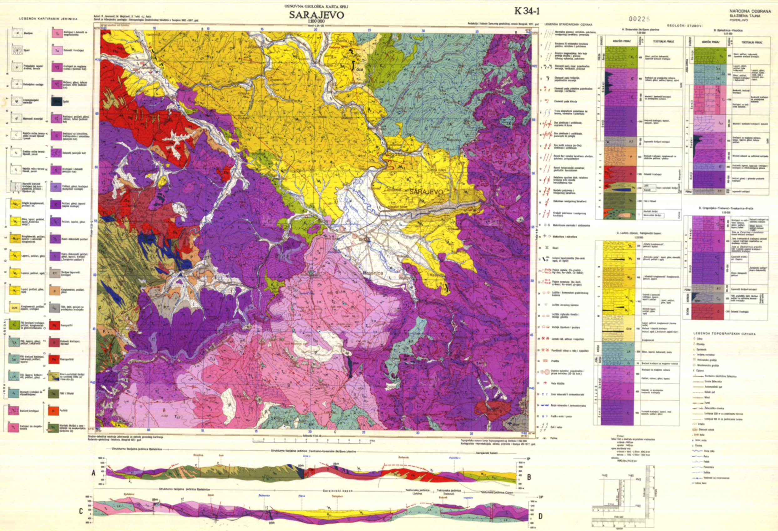 The Basic Geological Map (OGK) of Bosnia and Herzegovina at a scale of 1:100,000 began in 1961 and was officially completed in 1990. The work on its development was organized within the Geological Institute with headquarters in Iidža. Over 150 geological engineers and geological technicians participated in its implementation. The territory of Bosnia and Herzegovina is divided into sheets at a scale of 1:100,000, namely 23 full sheets (with an area of about 1,400 km) and 24 border sheets (whose area varied depending on the position of the BiH border). The Basic Geological Map was completed for the area of Bosnia and Herzegovina, but the Bosanski Novi sheet was not printed. The utility value of the Basic Geological Map is great. It contains a significant amount of geological information for the preparation of scientific research and applied projects in the field of mineral raw materials research; drinking thermomineral and mineral waters; in the fields of agriculture, forestry, construction and environmental protection. A particularly great contribution of this Map was in the training of professional staff in the field of geology. For the successful development of the Basic Geological Map, stable sources of funding from the state budget (budget), which is a practice throughout the world, were of crucial importance.