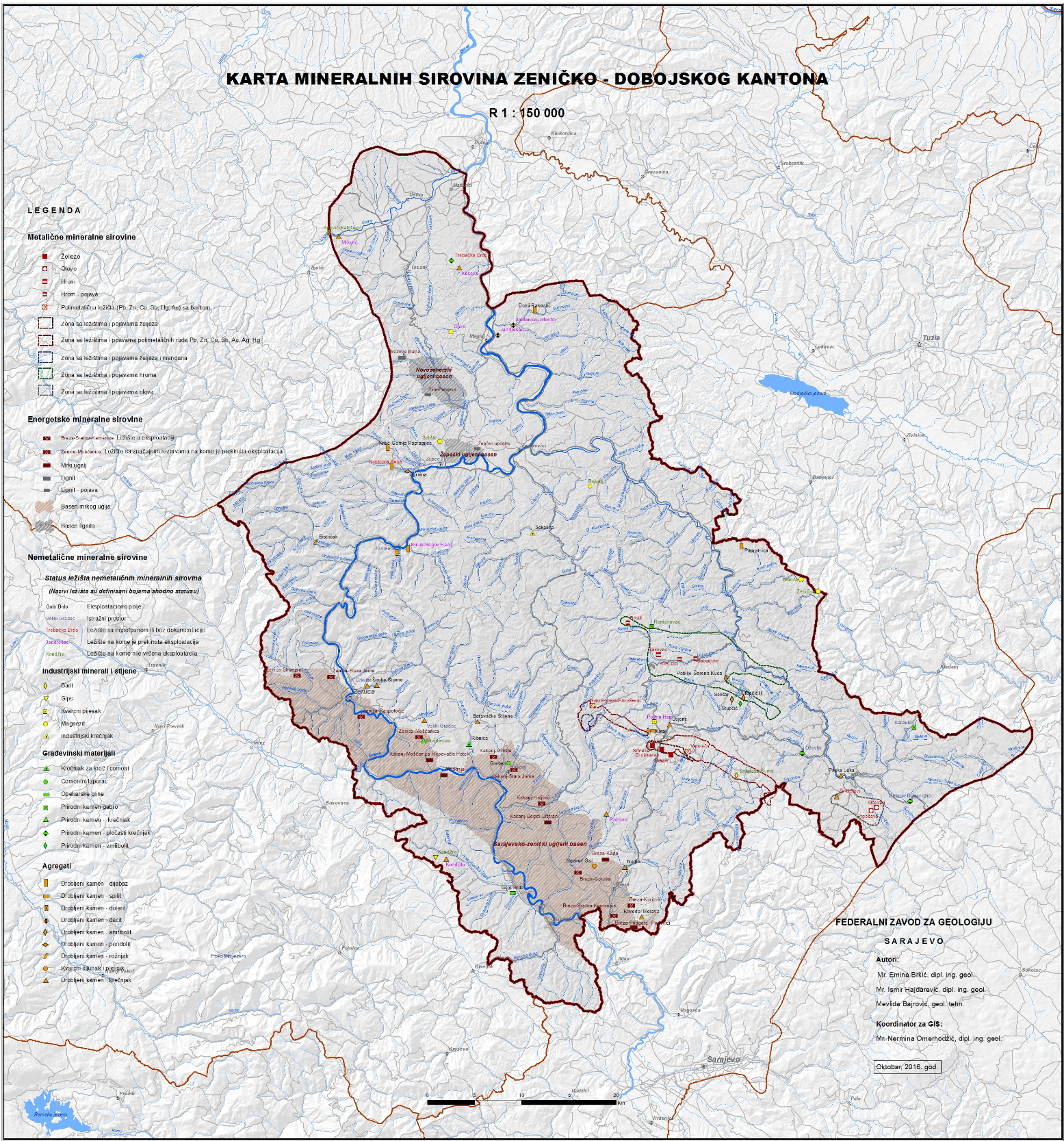 The cadastre of mineral resources of the Federation of Bosnia and Herzegovina consists of solid mineral resources whose reserves are determined, classified and recorded into categories and classes. Energy and nuclear mineral raw materials: peat, lignite, brown coal, hard coal, oil (bituminous) shale and uranium. Mineral raw materials from which metals and their useful compounds can be produced: copper, lead and zinc, mercury, antimony, red bauxites, iron, manganese, nickel, cobalt, chromium, gold, tungsten, molybdenum and tin. Non-metallic mineral raw materials: a) industrial mineral raw materials: gypsum and anhydrite, sodium (rock) salt, magnesite, barite, white bauxite, chrysotile asbestos, talc, pyrophyllite, bentonite, kaolin, ceramic and refractory clays, brick clays, halloysite, fluorite, feldspars, graphite, wollastonite, keramsite, slates, mica, diatomite, perlite, sulfur, cement marl, quartz sand, quartz, quartzite and quartz raw materials, tuff and carbonate mineral raw materials (dolomite, limestone, marble and chalk) and) building materials: technical - building stone, architectural - building stone, gravel and sand.