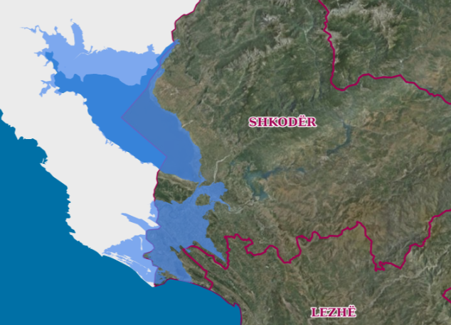 Map of flood risk areas in the Drin-Buna basin depending on the recurrence periods. The data are in accordance with the State Standard for Technical Specifications of Geospatial Information in Albania. Topic: Natural Hazard Areas