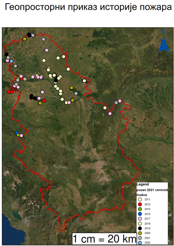 Прикупљање и обрада историјских података о шумским пожарима из извештаја са терена, унос у алфанумеричку базу за заштиту шума Основа ФПМ. Приказани подаци се односе искљичиво на шумске пожаре у државним шумама којима газдију ЈП „Војводинашуме“, Национални паркови као и на делу шума сопственика којима се газдује преко основа газдовања шумама.