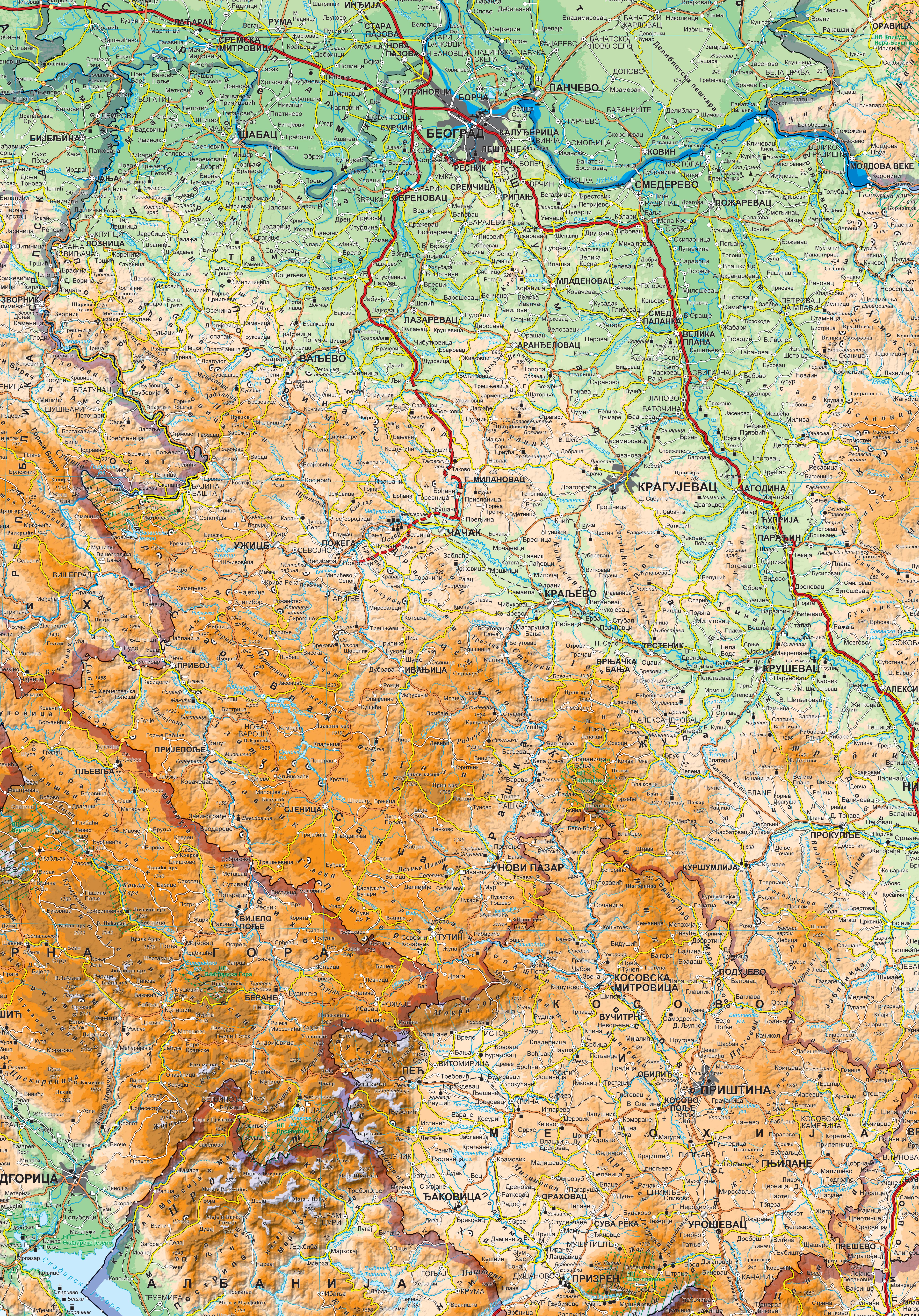 Geographic and tourist map of Serbia at a scale of 1 : 500 000 is a digital geographic map based on the cartographic database scale 1: 300 000, which represents a set of entities modeled by natural and man-made objects on the Earth's surface, that satisfy the conditions for display in the ratio 1 : 500 000.